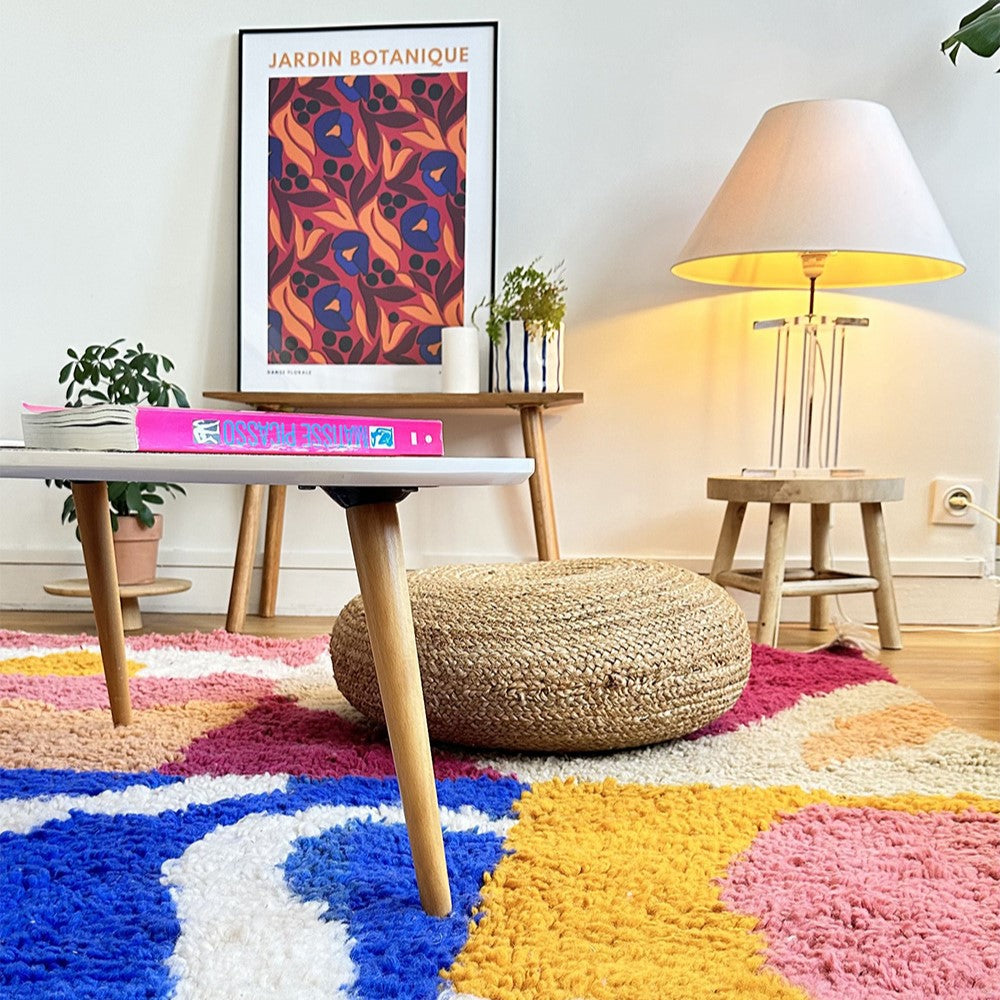 This rug is handwoven in the heart of the Beni Ouarain tribe, in a village of the Middle Atlas mountains, where rug weaving is a primary activity for women alongside farming. Our final price ensures that 20% goes directly to the artisans.